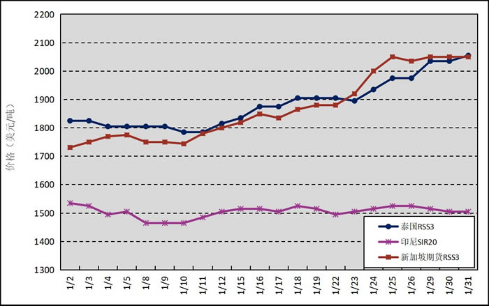 國外主產區:1月,泰國RSS3平均價格為1885美元/噸,環比上漲158美元/噸,最高價為2055美元/噸,最低價為1785美元/噸;印尼SIR20平均價格為1505美元/噸,環比上漲71美元/噸,最高價為1535美元/噸,最低價為1465美元/噸;新加坡RSS3期貨主力合約月均結算價格為1870美元/噸,環比上漲182美元/噸,最高價為2050美元/噸,最低價為1731美元/噸。