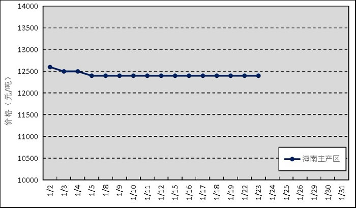 國內主產區:1月中下旬,海南產區全面停割,至此國內膠園全部進入停割期。海南原料膠(折干膠)月均價格為12425元/噸,環比上漲158元/噸。