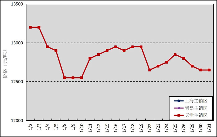 國內主銷區:1月,國產全乳標準膠上海市場平均價格12816元/噸,環比上漲202元/噸,最高價為13200元/噸,最低價為12550元/噸;青島市場平均價格12816元/噸,環比上漲202元/噸,最高價為13200元/噸,最低價為12550元/噸;天津市場平均價格12816元/噸,環比上漲202元/噸,最高價為13200元/噸,最低價為12550元/噸。