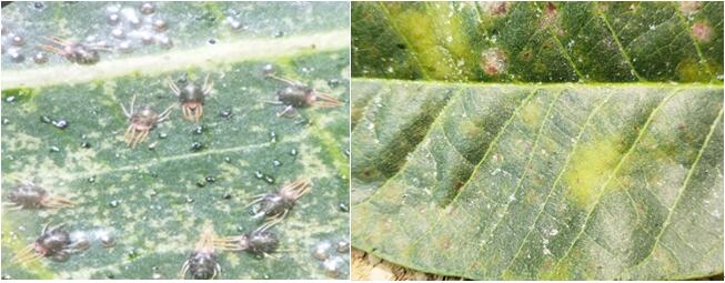 不同種類害螨危害癥狀有差別。六點始葉螨多在葉背危害,初期在葉脈基部呈現灰白色斑點,繼而沿葉脈擴展,同時顏色變深為黃色及黃褐色。六點始葉螨在嫩梢嫩葉的危害,呈現出受害部位顏色變深,扭曲畸形。東方真葉螨多在葉面危害,少見于葉背,受害部位出現白色小斑點,繼而小斑點匯結成灰綠色斑塊,嚴重者全葉枯黃。比哈小爪螨多發生在葉背危害,偶見葉面。葉片受害部位呈均勻的灰白色小斑點,發生嚴重時,整個葉片呈灰白色斑點,繼而整個葉片變黃,最后導致葉片枯黃。