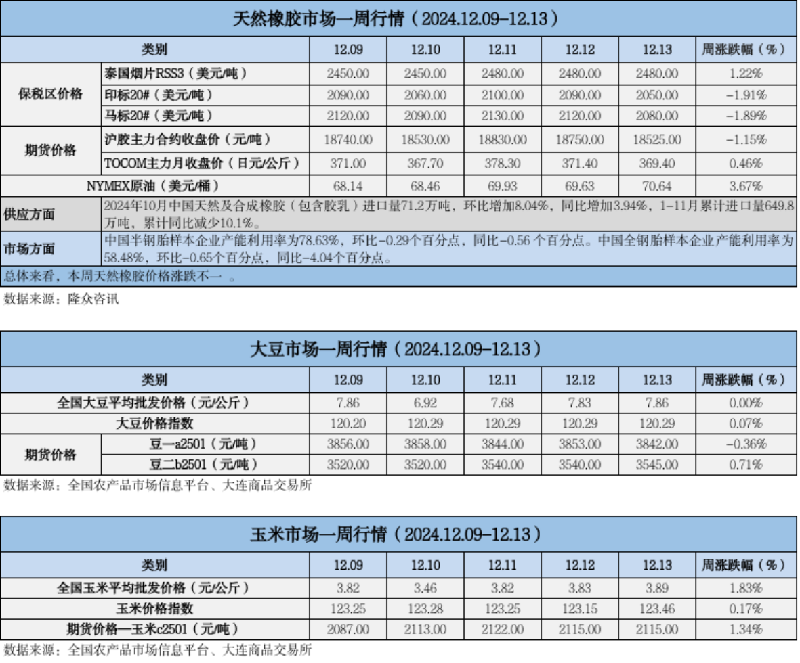 天然橡膠、大豆、玉米市場一周行情(2024.12.09-12.13)