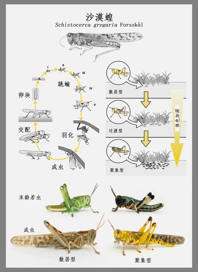 近期國外遭遇的沙漠蝗災(zāi)害,被認(rèn)為是世界上最具破壞性害蟲之一,起源于非洲,目前主要分布于非洲大陸、中東、南亞、西亞以及地中海沿岸,嚴(yán)重暴發(fā)的國家和地區(qū)多達(dá)60多個(gè)。在國內(nèi)曾有分類學(xué)上的記載,但中國不是沙漠蝗的分布區(qū),過去曾頻繁暴發(fā)的蝗災(zāi)并非沙漠蝗引起。沙漠蝗具有暴發(fā)性、遷飛性和毀滅性危害特點(diǎn),嚴(yán)重時(shí)蟲口密度,每平方公里可達(dá)8000萬只、進(jìn)食量與3.5萬人的進(jìn)食量相當(dāng),每天可以隨風(fēng)飛行150公里,被蝗蟲肆虐過的作物可以說是寸葉不留。危害植物包括水稻、小麥、大麥、玉米等谷物,番茄、馬鈴薯、瓜類等各類蔬菜,苜蓿、豆類、棉花、煙草、花生等農(nóng)作物及葡萄、扁桃、杏樹、柑桔、香蕉、番木瓜、海棗、無花果、石榴等果樹和桑樹、咖啡等。目前尚未發(fā)現(xiàn)危害橡膠的報(bào)道。沙漠蝗嗜好在濕潤的沙地上產(chǎn)卵,每平方米多達(dá)上百個(gè)卵塊,每雌可產(chǎn)3—4個(gè)卵塊150—240粒卵。卵期3周左右,土壤濕度充分時(shí)16—17天可孵化,干燥條件下則長達(dá)近40天。從蝗蝻發(fā)育至成蟲大約需要一個(gè)月,成蟲羽化約1個(gè)月后開始配對。沙漠蝗分聚集型和散居型,兩種類型在個(gè)體大小、體色及生物學(xué)特性等存在一定差別。據(jù)專家分析,當(dāng)前沙漠蝗的暴發(fā)與蟲源積累及降雨偏多有關(guān)。