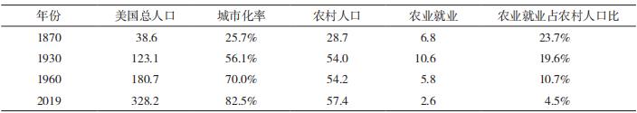 數(shù)據(jù)來源:美國人口數(shù)、城市化率數(shù)據(jù)來自美國勞動統(tǒng)計(https://www.bls.gov/),1960年以前農(nóng)業(yè)就業(yè)數(shù)據(jù)來自LaborForceandEmployment,1800—1960(http://www.nber.org/books/brad66-1);2019農(nóng)業(yè)就業(yè)數(shù)據(jù)來自美國農(nóng)業(yè)部經(jīng)濟研究局(https://www.ers.usda.gov/data-products/chart-gallery/gallery/chart-detail/?chartId=58282)