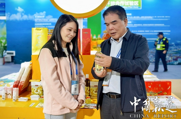 柳烈(右)向采購商介紹廣東農墾參展產品(陳若欣 攝)