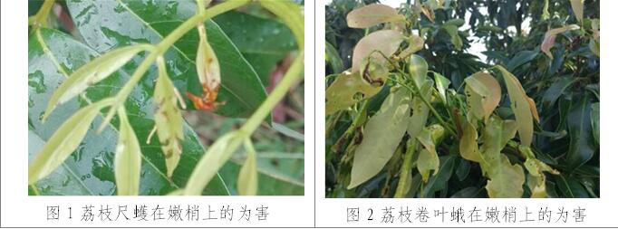 成蟲和若蟲以刺吸式口器在嫩梢的葉片上吸食為害,嚴重影響嫩梢的生長。荔枝褶粉虱一般在葉背為害,造成葉內卷,為害嚴重時,葉面會出現黃色斑點。該蟲的排泄物可誘發煤煙病,影響葉片光合作用。荔枝褶粉虱主要發生在通透性差的密閉果園,在通風透光良好的間伐果園,該蟲則為害較輕。而荔枝葉螨于葉面為害,葉片細胞被破壞而喪失葉綠素,造成葉片呈現黃白色小斑點,嚴重時造成葉片卷曲、變褐至落葉。