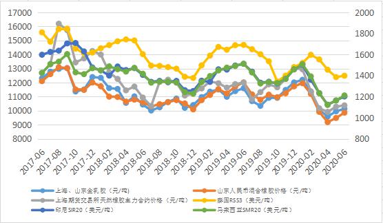上半年天然橡膠市場價格總體處于低位。1-4月,受新冠肺炎疫情影響,市場交易低迷,價格下行,月均價環(huán)比跌幅最高達22.9%;5-6月,產(chǎn)業(yè)上下游復(fù)工復(fù)產(chǎn),全球貿(mào)易逐步恢復(fù),各國出臺刺激政策提振經(jīng)濟,價格震蕩回調(diào),月均價環(huán)比止跌回正,最高至3%-4%。上半年現(xiàn)貨國內(nèi)市場全乳膠上海、山東市場均價每噸10423元,同比跌7.7%;混合膠山東市場均價每噸10151元,同比跌12.8%。現(xiàn)貨東南亞市場,泰國RSS3均價每噸1475美元,同比跌9.5%;印尼SIR20均價每噸1249美元,同比跌13.9%;馬來西亞SMR20均價每噸1251美元,同比跌13.4%。期貨市場上期所主力合約均價每噸10769元,同比跌9.5%。