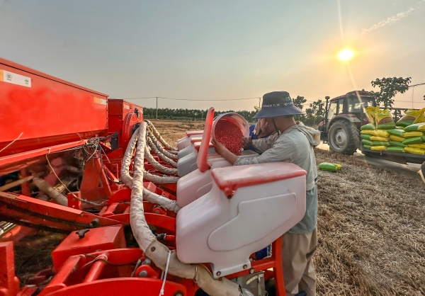 “現(xiàn)在種地全靠農(nóng)機(jī)助力!”農(nóng)機(jī)中心副主任王峰一邊指導(dǎo)農(nóng)機(jī)手調(diào)試播種機(jī),一邊介紹。東辛分公司配齊了適合帶狀復(fù)合種植模式的全套農(nóng)機(jī),從翻地、播種到打藥、收割,全程機(jī)械化操作。播種時(shí),帶北斗導(dǎo)航的氣力式播種機(jī)大顯身手,不僅走得筆直,下種量均勻,株距行距也能精準(zhǔn)控制。打藥階段,分帶噴霧機(jī)可根據(jù)大豆和玉米的不同需求單獨(dú)調(diào)整藥量,既保證藥效,又節(jié)省藥水,作業(yè)效率大幅提升。