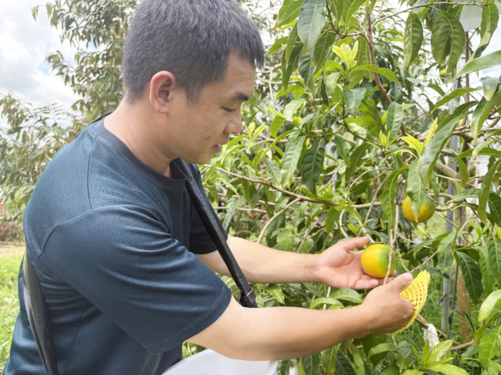 據(jù)介紹,該基地面積為360畝,于2022年引入黃晶果試種,2024年實現(xiàn)首次零星掛果?!拔覀冎饕N植的是‘黃寶石’品種,具有抗病性強、產(chǎn)量穩(wěn)定等特點。今年實現(xiàn)了穩(wěn)定掛果,每棵樹產(chǎn)量約150斤,基地年產(chǎn)量達50萬斤?!痹撠撠熑私榻B,目前基地的黃晶果尚處于初產(chǎn)期,到2026年將迎來豐產(chǎn)期,產(chǎn)量預計將有進一步的提升。