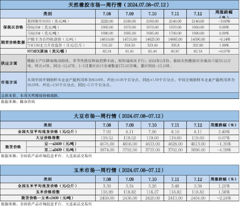天然橡膠、大豆、玉米市場(chǎng)一周行情(2024.07.08-07.12)