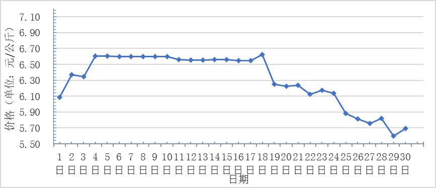 9月,全國重點監測農產品批發市場香蕉總交易量達2.5萬噸,同比下降10.7%,環比上漲8.7%;總交易價值 16111.8萬元,同比下降4%,環比上漲11.6%。日平均價格最高為6.6元/千克,最低為5.6元/千克,全月平均價格為6.3元/千克,同比上漲14.5%,環比上漲3.3%(每日價格變化如圖)。