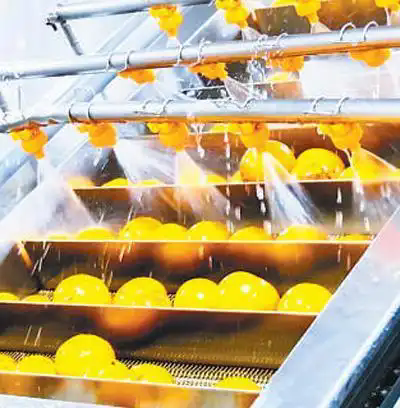 在浙江艾佳果蔬開發有限責任公司,胡柚正在生產線上進行清洗。