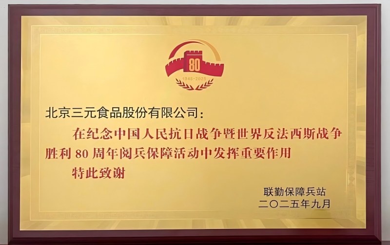 2025年9月3日,中國人民抗日戰(zhàn)爭暨世界反法西斯戰(zhàn)爭勝利80周年紀念活動隆重舉行。在這場國家盛事的背后,三元食品以高度的責任感和使命感,全力肩負起訓練基地乳制品及閱兵餐包酸奶的供應保障任務,以卓越的產(chǎn)品和可靠的服務,全面踐行著國有企業(yè)的責任與擔當。