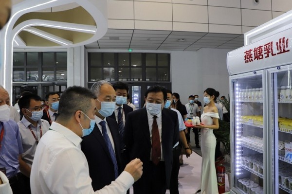農(nóng)業(yè)農(nóng)村部副部長馬有祥(前排中)、山東省副省長江成(前排右)參觀燕塘乳業(yè)展區(qū)