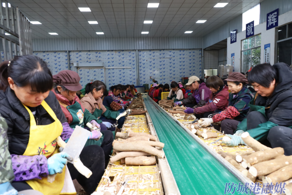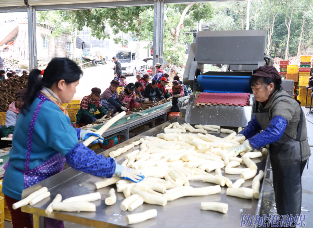 3月17日,記者走進位于防城區大菉鎮山中村的喜農人種養專業合作社“華南9號”黃心木薯加工廠,映入眼簾的是一片繁忙景象:200余名村民分工協作,熟練地對木薯進行去根、削皮、取芯處理。清理后的木薯通過傳送帶進入清洗機,再經過真空打包后送入冷凍庫冷藏,等待發貨。機器轟鳴聲與村民們的默契配合交織在一起,奏響了一曲充滿活力的鄉村“奮進曲”。