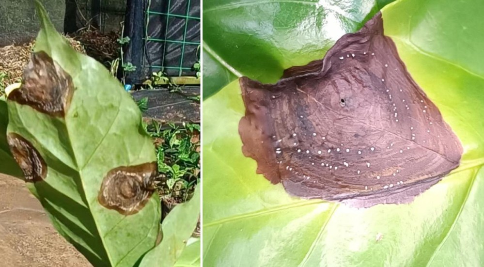 發病初期,葉片表面出現水漬狀斑點,擴展較快,3~5 天后病斑中央呈灰白色至褐色,邊緣暗褐色。典型病斑呈深淺交替同心輪紋狀,正背面相似,病斑下陷、易破裂。發病葉片病健交界處有明顯黃色暈圈(圖1),病斑輪紋處常生白色小顆粒,分生孢子座為墨綠色至黑色,菌絲為白色(圖2)。發病后期,病斑蔓延至整個葉片乃至莖干,造成葉片掉落,嚴重時咖啡整株死亡(圖3)。該病常與咖啡炭疽病混發,加重危害。
