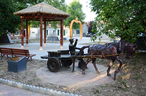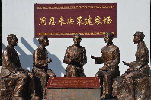 進入大院便是奮進園,周恩來總理和幾位墾荒者的巨型雕塑矗立其中。巨雕西面是群體雕塑“周恩來決策建農場”;東面是一條綠樹掩映的半圓形文化長廊,展出著農場各個時期的珍貴照片;南面是“福滿路”,路上錯落分布著五個巨大的蘋果門,每個門上各有一種糧食作物的圖案,寓意平平安安、五谷豐登。福滿路兩側立著24節氣石牌。