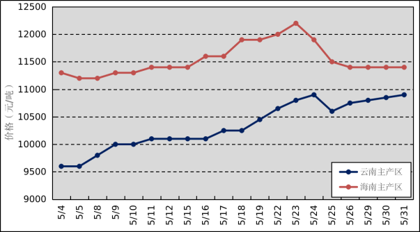 國內主產區:5月,受干旱和病蟲害影響,云南產區膠水產出雖進入旺產期,但較往年同期產量偏少;海南產區物候條件良好,膠水穩定產出。云南和海南原料膠(折干膠)月均價格分別為10330元/噸、11535元/噸,環比上漲90元/噸、205元/噸。