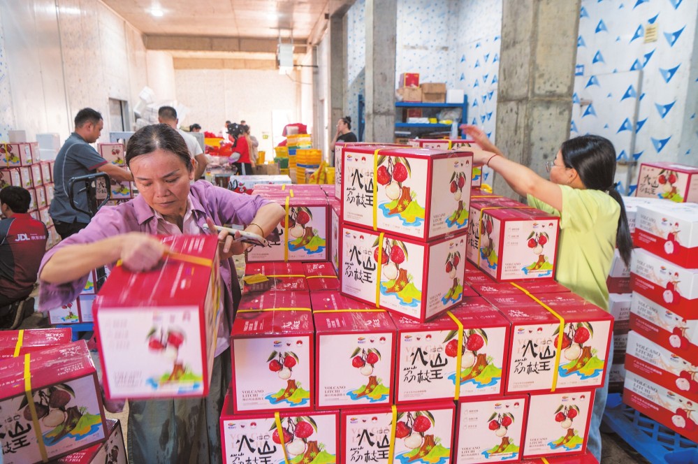 近日,在??诨鹕嚼笾Ψ謷行?,工作人員正打包新鮮采摘的火山荔枝王。本報記者 石中華 攝