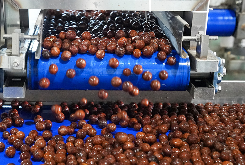 青果經過脫皮、清洗、分色、剝殼、浮選、烘烤等工序后,變成棕色的殼果。刁弘智攝