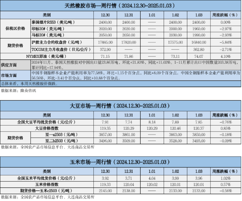天然橡膠、大豆、玉米市場一周行情(2024.12.30-2025.01.03)