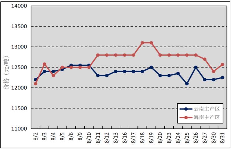 國內(nèi)主產(chǎn)區(qū):8月,我國天然橡膠主產(chǎn)區(qū)步入割膠旺季,但云南產(chǎn)區(qū)多雨,產(chǎn)出受影響。海南原料膠(折干膠)月均價格為12675元/噸,環(huán)比上漲578元/噸,云南原料膠(折干膠)月均價格為12364元/噸,環(huán)比增長134元/噸。