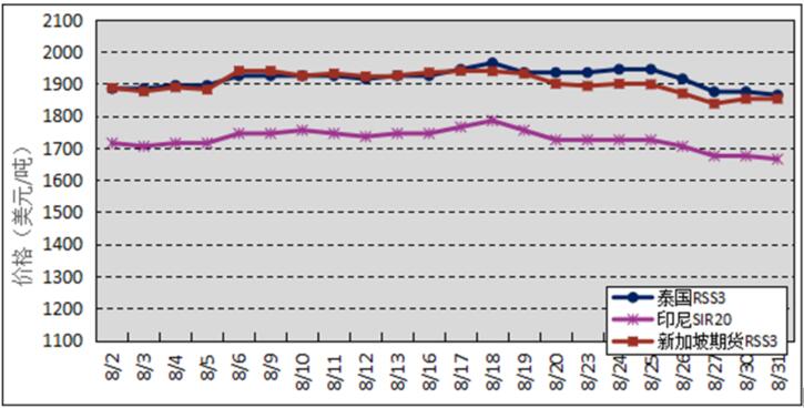 國外主產(chǎn)區(qū):8月,泰國RSS3平均價格為1916美元/噸,環(huán)比下降133美元/噸,最高價為1965美元/噸,最低價為1865美元/噸;印尼SIR20平均價格為1727美元/噸,環(huán)比上漲82美元/噸,最高價為1785美元/噸,最低價為1665美元/噸;新加坡RSS3期貨主力合約月均結算價格為1903美元/噸,環(huán)比下降46美元/噸,最高價為1940美元/噸,最低價為1838美元/噸。