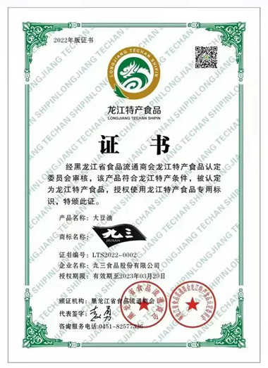 根據(jù)專家審定,“九三”大豆油符合龍江特產(chǎn)食品復(fù)審標(biāo)準(zhǔn),省食品流通商會(huì)龍江特產(chǎn)食品認(rèn)定委員會(huì)決定,為九三糧油工業(yè)集團(tuán)有限公司頒發(fā)標(biāo)識(shí)牌和“龍江特產(chǎn)食品”專用標(biāo)識(shí)許可使用證書。