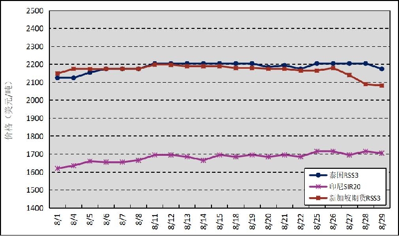 國外主產(chǎn)區(qū):8月,泰國RSS3平均價格為2186美元/噸,環(huán)比下跌59美元/噸,最高價為2205美元/噸,最低價為2125美元/噸;印尼SIR20平均價格為1682美元/噸,環(huán)比上漲24美元/噸,最高價為1715美元/噸,最低價為1620美元/噸;新加坡RSS3期貨主力合約月均結(jié)算價格為2168美元/噸,環(huán)比下跌87美元/噸,最高價為2199美元/噸,最低價為2082美元/噸。