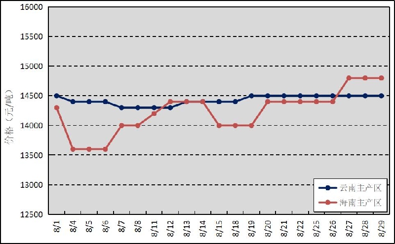 圖3 2025年8月國內(nèi)主銷區(qū)天然橡膠價格走勢