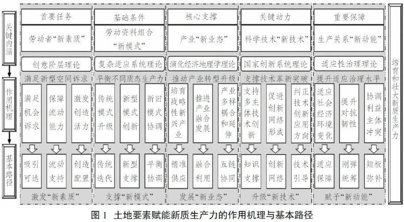 在創(chuàng)意階層理論、復雜適應系統(tǒng)理論、演化經濟地理學理論、國家創(chuàng)新系統(tǒng)理論、新熊彼特主義理論和適應性治理理論等諸多理論的支撐下,土地要素及其配置制度能夠通過激發(fā)勞動者群體“新素質”,平衡傳統(tǒng)生產力和新質生產力的要素組合模式,保障支撐產業(yè)轉型升級,推動原創(chuàng)性、顛覆性技術革新以及適配引導新質生產力發(fā)展有效賦能新質生產力發(fā)展。