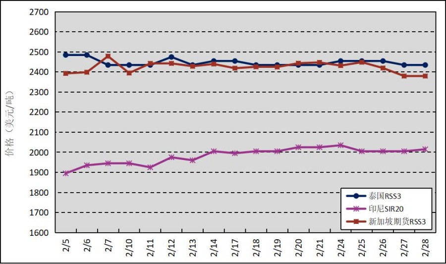 國外主產區:2月,泰國RSS3平均價格為2448美元/噸,環比上漲21美元/噸,最高價為2485美元/噸,最低價為2435美元/噸;印尼SIR20平均價格為1984美元/噸,環比上漲81美元/噸,最高價為2035美元/噸,最低價為1895美元/噸;新加坡RSS3期貨主力合約月均結算價格為2425美元/噸,環比上漲35美元/噸,最高價為2479美元/噸,最低價為2380美元/噸。