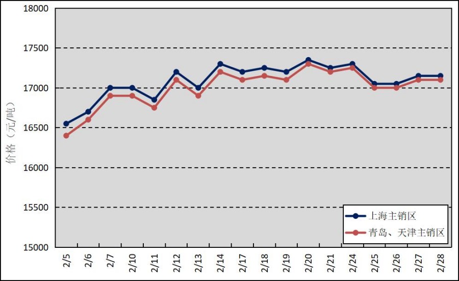 國內主銷區:2月,國產全乳標準膠上海市場平均價格17086元/噸,環比上漲586元/噸,最高價為17350元/噸,最低價為16550元/噸;青島市場和天津市場平均價格17003元/噸,環比上漲617元/噸,最高價為17300元/噸,最低價為16400元/噸。