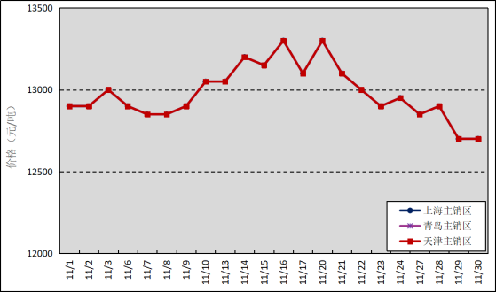 國內主銷區:11月,國產全乳標準膠上海市場平均價格12980元/噸,環比下跌214元/噸,最高價為13300元/噸,最低價為12700元/噸;青島市場平均價格12980元/噸,環比下跌214元/噸,最高價為13300元/噸,最低價為12700元/噸;天津市場平均價格12980元/噸,環比下跌214元/噸,最高價為13300元/噸,最低價為12700元/噸。