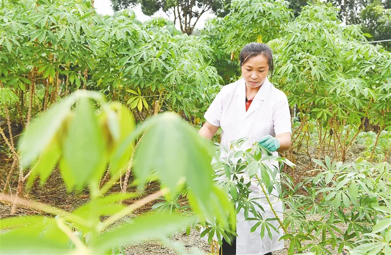 中國熱帶農業科學院科研人員查看木薯生長情況。新華社發