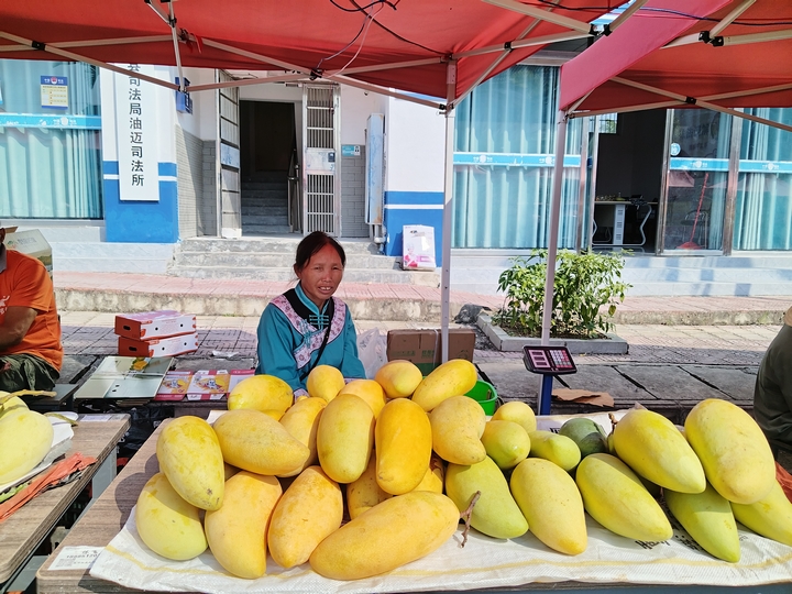 盛夏七月,正是芒果飄香的季節。黔西南布依族苗族自治州望謨縣油邁瑤族鄉芒果集市上,100多個芒果攤位呈半圓形擺開。一個個圓潤飽滿的芒果,在陽光的照射下,透出誘人的光澤,空氣中散發出芒果的清香。
