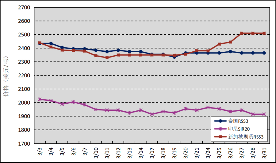 國外主產區:3月,泰國RSS3平均價格為2378美元/噸,環比下跌70美元/噸,最高價為2435美元/噸,最低價為2335美元/噸;印尼SIR20平均價格為1954美元/噸,環比下跌30美元/噸,最高價為2025美元/噸,最低價為1915美元/噸;新加坡RSS3期貨主力合約月均結算價格為2395美元/噸,環比下跌30美元/噸,最高價為2510美元/噸,最低價為2330美元/噸。