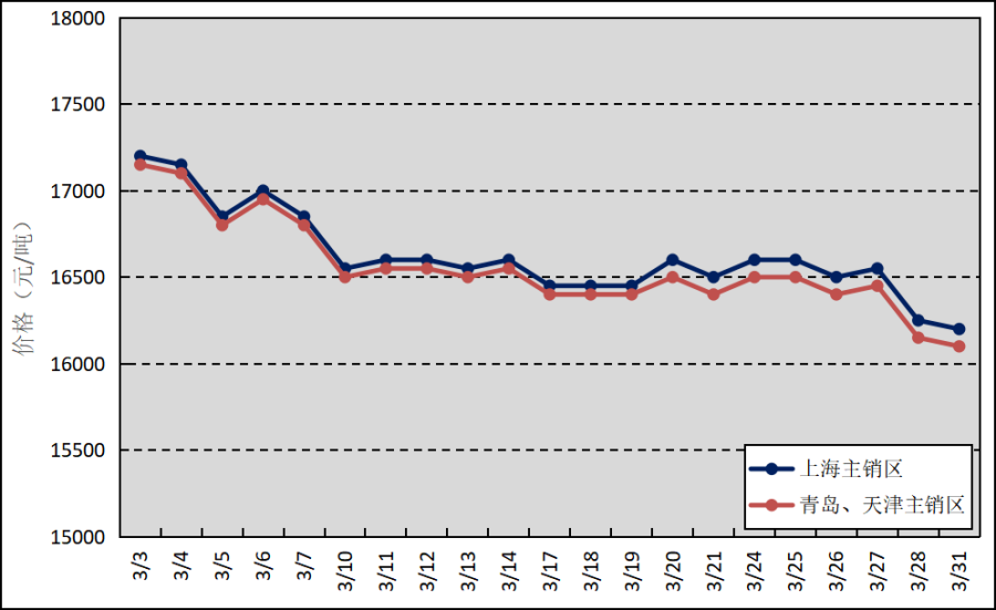 國內主銷區:3月,國產全乳標準膠上海市場平均價格16624元/噸,環比下跌462元/噸,最高價為17200元/噸,最低價為16200元/噸;青島市場和天津市場平均價格16555元/噸,環比下跌448元/噸,最高價為17150元/噸,最低價為16100元/噸。