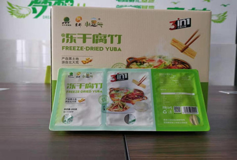 含量高:蛋白質含量比烘干腐竹高15%、脂肪含量比烘干腐竹高 8%。先進的真空凍干技術,取代傳統的高溫烘干腐竹工藝,低溫工藝保障腐竹自身的大豆蛋白不變性、不破壞、不流失。