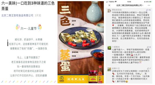 二商股份王致和為慶?!傲弧眱和?jié)到來,在微信公眾號即時推出“一口吃到三種味道的三色蒸蛋”定制食譜,并以“你最難忘的‘六一’是什么樣的呢?”為話題,開展留言區(qū)抽獎活動,得到眾多粉絲的關(guān)注和參與。