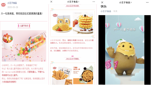京糧控股所屬小王子以“‘六一’禮物來啦,帶你找回儀式感滿滿的童真”為主題,通過微信公眾號圖文并茂制作“土豆仔”攻略,推出兒時的經(jīng)典回味聰明棒、燒麥,新時代的王紅零食——非油炸更健康的“堅強的土豆片”多味禮盒,顆顆金黃立體、顏值炸裂、口口酥香薄脆的“嘣咔嚓咔嚓”四層玉米片,芝士、面粉、雞蛋完美碰撞誕生的超治愈系蛋糕“小王子華夫餅”,辣感十足、線位置就、好吃不干燥、嗨吃不油膩的“小王子干辣條”,通過這些精致的美味,喚起大家美好童年的回憶。