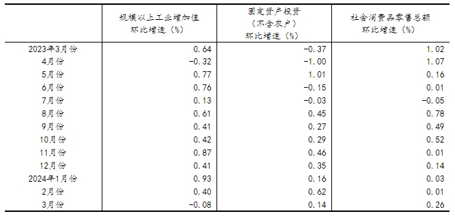 (2)根據季節調整模型自動修正結果,對近一年來各期國內生產總值、規模以上工業增加值、固定資產投資(不含農戶)、社會消費品零售總額環比增速進行修訂。修訂結果及2024年一季度GDP環比數據、2024年3月份其他指標環比數據如下: