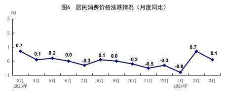 一季度,全國居民消費價格(CPI)同比持平。分類別看,食品煙酒價格下降1.7%,衣著價格上漲1.6%,居住價格上漲0.2%,生活用品及服務價格上漲0.8%,交通通信價格下降1.4%,教育文化娛樂價格上漲2.3%,醫療保健價格上漲1.4%,其他用品及服務價格上漲2.9%。在食品煙酒價格中,鮮果價格下降7.3%,豬肉價格下降7.0%,鮮菜價格下降3.9%,糧食價格上漲0.4%??鄢称泛湍茉磧r格后的核心CPI同比上漲0.7%。3月份,全國居民消費價格同比上漲0.1%,環比下降1.0%。