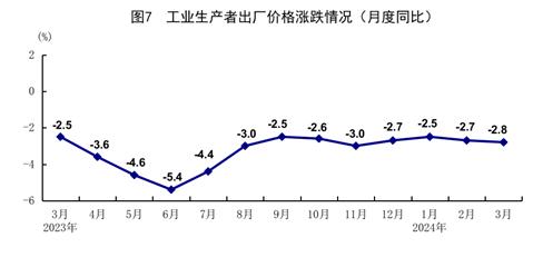 一季度,全國工業生產者出廠價格同比下降2.7%。其中,3月份同比下降2.8%,環比下降0.1%。一季度,工業生產者購進價格同比下降3.4%。其中,3月份同比下降3.5%,環比下降0.1%。
