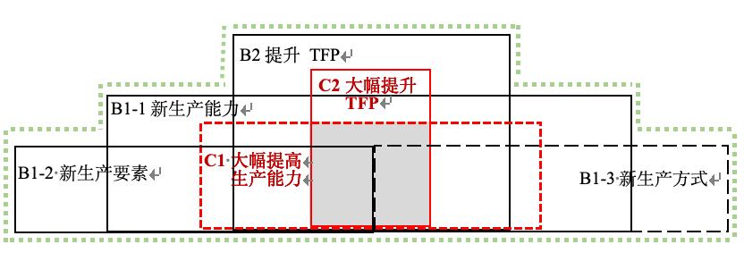 兩個必要條件。必要條件一是至少要滿足如下3個條件之一。(1)B1-1:提高了生產(chǎn)能力,產(chǎn)品包括已有產(chǎn)品、改善的產(chǎn)品、新的產(chǎn)品和促進公平與綠色等高質(zhì)量發(fā)展的產(chǎn)品。(2)B1-2:生產(chǎn)上利用了新的生產(chǎn)要素,包括能力得到提升的勞動者、質(zhì)量安全等得到改善的生產(chǎn)要素和新的生產(chǎn)要素(例如,數(shù)據(jù)、信息、知識、新技術(shù)等)。(3)B1-3:生產(chǎn)上采用了新的生產(chǎn)方式,是“勞動者、勞動資料、勞動對象”的“優(yōu)化組合”及其“體制機制創(chuàng)新”等的體現(xiàn)。必要條件二是新的全要素生產(chǎn)率必須高于舊的全要素生產(chǎn)率。實踐中可以通過“科技創(chuàng)新和改革創(chuàng)新”等促進新的生產(chǎn)要素和新的生產(chǎn)方式等采用來提高全要素生產(chǎn)率。新質(zhì)生產(chǎn)力的內(nèi)涵范圍見圖1中外圍。
