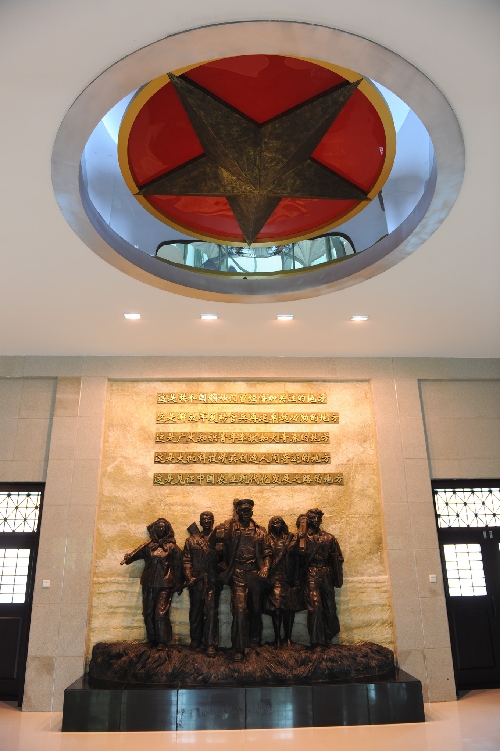 序廳展有主題雕塑,雕塑是開發建設北大荒群體中的復轉官兵、知識青年、支邊青年、科技人員和現代青年五位代表人物的形象,主題雕塑上方是紅興隆博物館的主題詞。