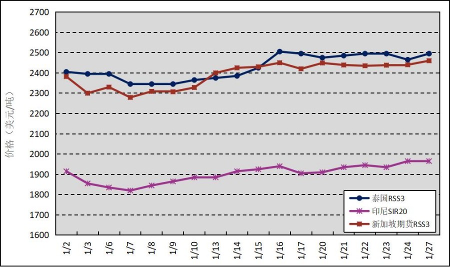 國外主產區:1月,泰國RSS3平均價格為2427美元/噸,環比下跌30美元/噸,最高價為2505美元/噸,最低價為2345美元/噸;印尼SIR20平均價格為1903美元/噸,環比下跌63美元/噸,最高價為1965美元/噸,最低價為1820美元/噸;新加坡RSS3期貨主力合約月均結算價格為2390美元/噸,環比下跌34美元/噸,最高價為2460美元/噸,最低價為2279美元/噸。