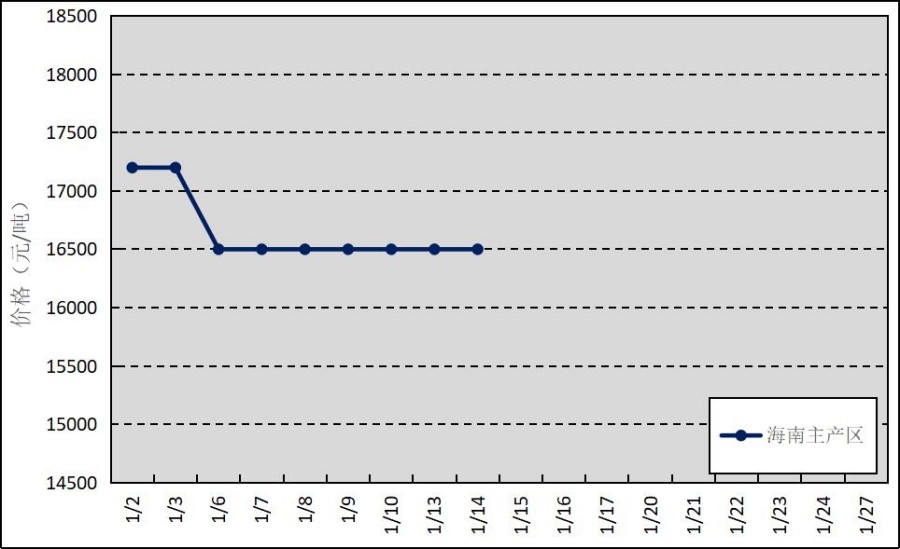 國內主產區:1月中旬,海南產區停割,至此國內膠園全部進入停割期。海南原料膠(折干膠)月均價格為16656元/噸,環比下跌626元/噸。