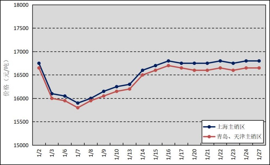 國內主銷區:1月,國產全乳標準膠上海市場平均價格16500元/噸,環比下跌736元/噸,最高價為16800元/噸,最低價為15900元/噸;青島市場和天津市場平均價格16386元/噸,環比下跌764元/噸,最高價為16700元/噸,最低價為15800元/噸。