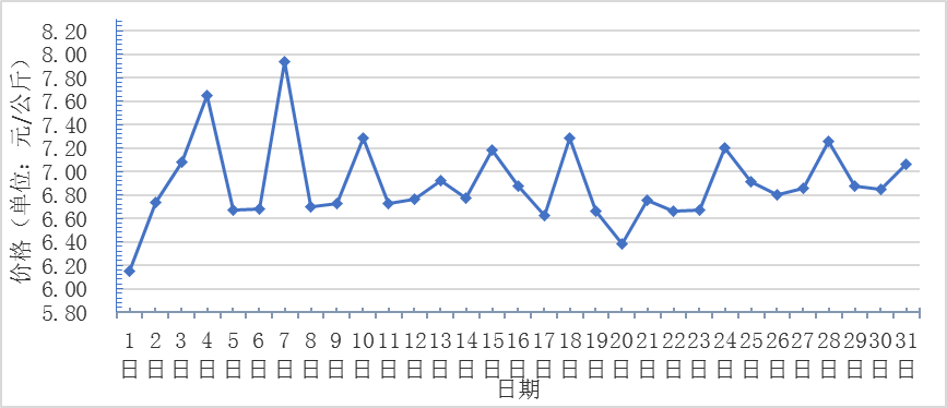 10月,全國重點監測農產品批發市場香蕉總交易量達2.3萬噸,同比上漲9.5%,環比下降11.5%;總交易價值15349.4萬元,同比上漲11.9%,環比下降4.9%。日平均價格最高為8.0元/千克,最低為6.2元/千克,全月平均價格為 6.9元/千克,同比上漲3.0%,環比上漲13.1%(每日價格變化如圖)。
