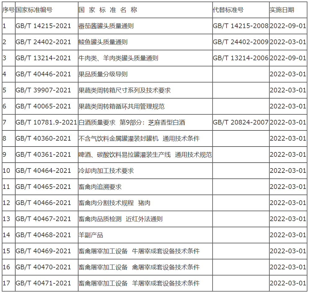 8月26日,國家市場監督管理總局、國家標準化管理委員會聯合發布了2021年第11號國家標準公告,該公告共發布450項推薦性國家標準和4項國家標準修改單。其中,涉及3項罐頭食品通則、3項果蔬相關標準、3項酒類飲料相關標準以及多項畜禽肉等加工技術標準。詳情見下表。